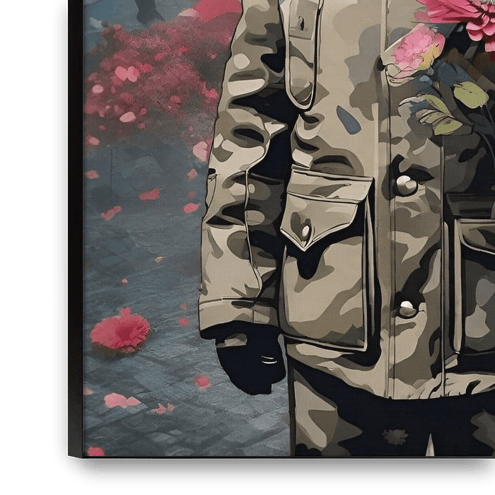 The image shows an artistic and surreal representation of a panda with the head of a real panda, but dressed in a human outfit. The panda wears a camouflage jacket with epaulettes and a badge on its chest, suggesting a military or rugged appearance. In its arms, the panda holds a large, bright pink flower (possibly a gerbera), which…