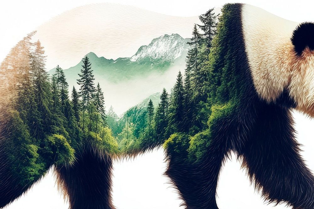A majestic panda, whose body is interspersed with lush forests and rolling hills, symbolises the harmonious combination of nature and wildlife. The soft colours and detailed depiction invite you to dream. This work of art idealises the living room, where it creates a calming, inspiring atmosphere and encourages conversation.