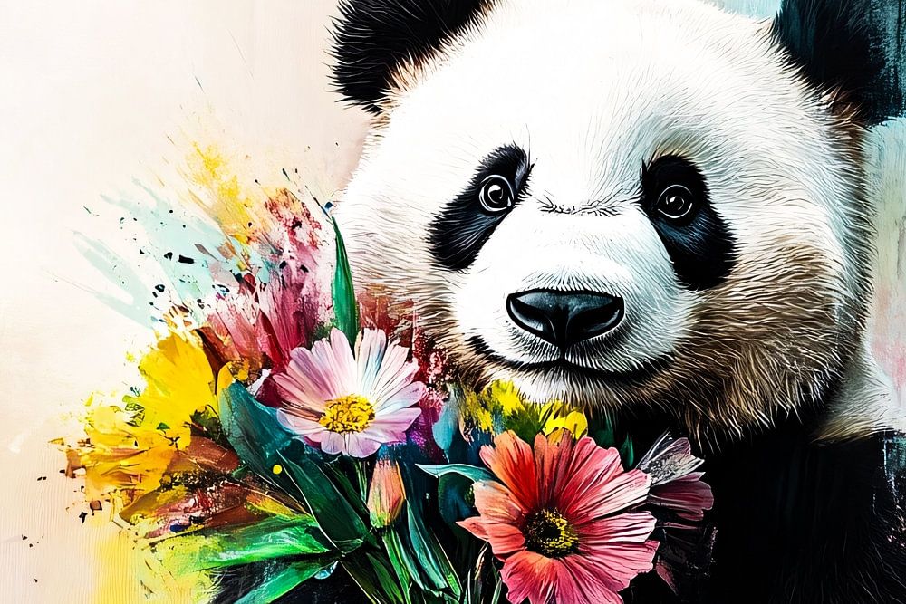 This unique image shows an adorable panda holding a bunch of colourful flowers. The combination of the soft colours of the flowers and the neutral tones of the panda makes this design perfect for a variety of interior styles. The colourful, playful design brings cheer and warmth to any room. Whether you are looking for an eye-catching piece of art for a children's room, hobby room or a cosy spot in your home, this painterly design is a real eye-catcher.