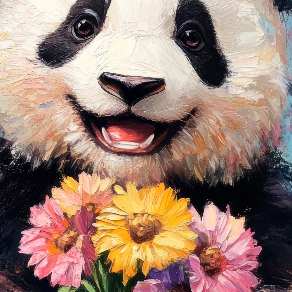 A cheerful panda with a bright smile and sparkling eyes lovingly holds a colourful bouquet of flowers. The vibrant colours in the background lend the scene a cheerful atmosphere and emphasise the playfulness of this charming creature. It is a picture full of warmth and joie de vivre that captures hearts in a flash.