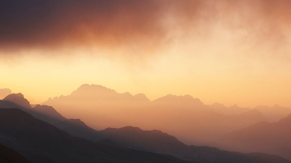Panorama Dolomites at sunrise. A beautiful view made from the Pas de la Sele near San Pellegrino in South Tyrol, Italy. The Dolomites are part of the Alps and are located on the south-east side of the mountain range.