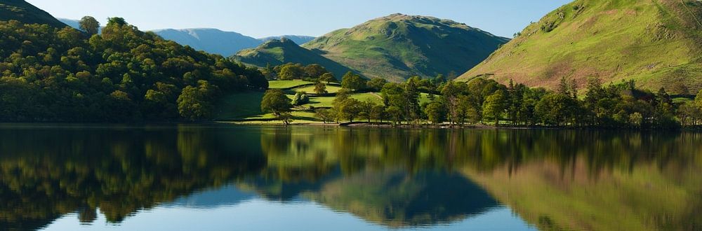 Panorama of the Lake District, England overlooking Ullswater. The water surface reflects the hills including Arthur's Pike. The Lake District lends itself very well to panoramic photography because of its beautiful landscapes and beautiful lakes. The area, which is part of the county of Cumbria is a National Park and is on the Unesco World Heritage List.