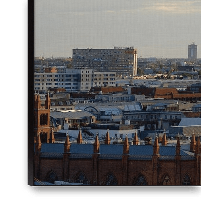 The photo offers an impressive panoramic view of Berlin. In the centre, we see a hot air balloon floating above the city, giving a unique perspective. The skyline is characterised by iconic buildings and structures, including domes and towers such as Berliner Dom. The architecture ranges from historic to modern, creating a rich urban…