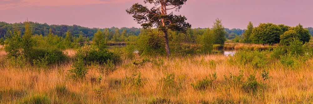A wide 3:1 panorama image of a sunrise over a fens in the Dwingelderveld National Park, the largest wet heathland area in Western Europe. Located in the Dutch province of Drenthe, in the Dwingeloo, Ruinen and Beilen triangle.