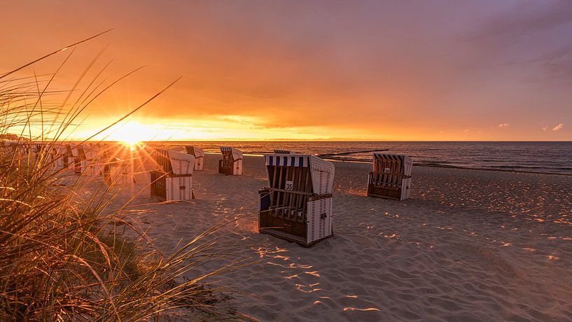 Panoramic photo of beach grass and beach chairs on the beach in the Baltic seaside resort of Kühlungsborn on the Baltic Sea at sunset, Baltic Sea coast, Mecklenburg-Western Pomerania, Germany