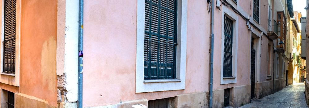 About "Panorama city view of narrow streets at the old town of Palma de Majorca, Spain"