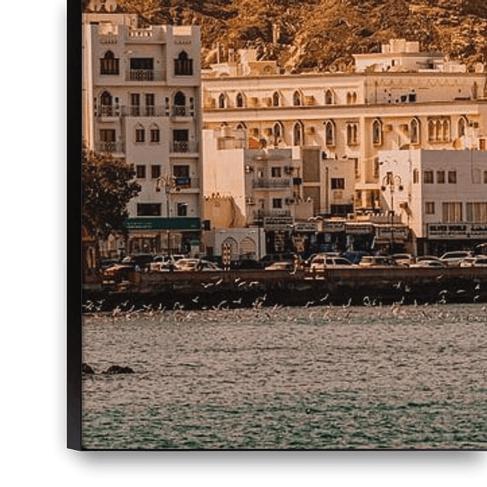 Buy this landscape artwork Panorama harbour skyline Muscat in Oman at sunset by Dieter Walther on canvas, ArtFrame, poster and wallpaper, printed on demand in high quality.