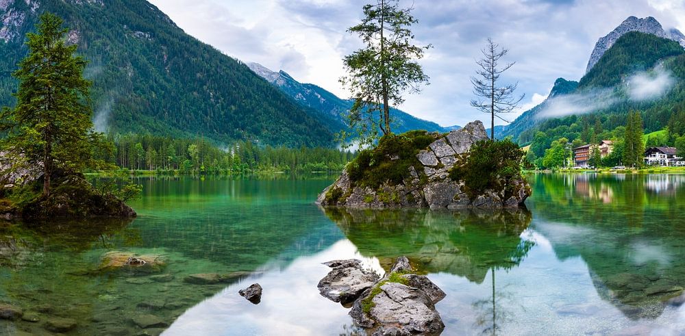 Panoramic view of the Hintersee in the Berchtesgaden Magic Forest on a cloudy summer's day