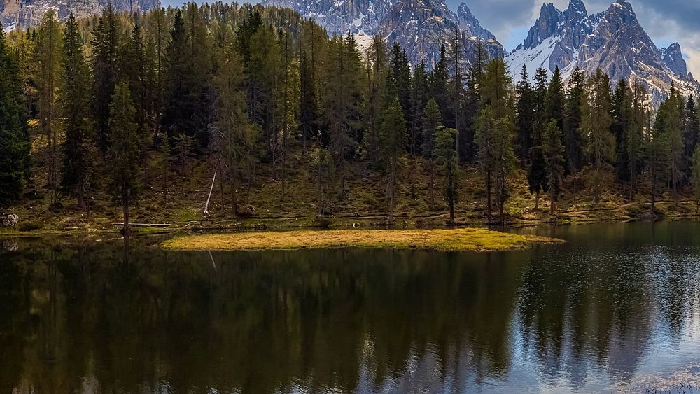 A 16:9 panorama photo of Lake Antorno (Lago d'Antorno), a small mountain lake in the Italian Dolomites. It is located in the north of the province of Belluno near the town of Misurina at an altitude of 1866 metres.