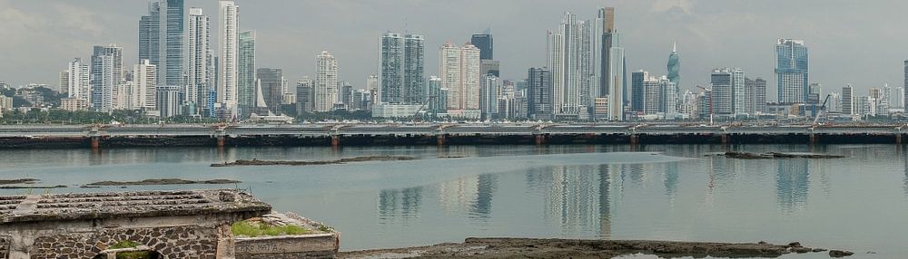 Panorama of Panama City in Panama. The photo was taken from Casco Viejo, the old part of the city. In the foreground an old construction can be seen. In the background the modern area (downtown) of the city. In the sea you can see the reflection of the buildings.
