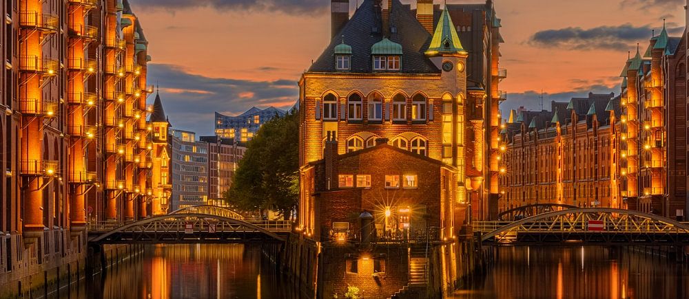 A wide panoramic view of the Speicherstadt, located in Hamburg, Germany, and is a complex of warehouses built between 1883 and 1927 on a series of islets in the Elbe riverbed.