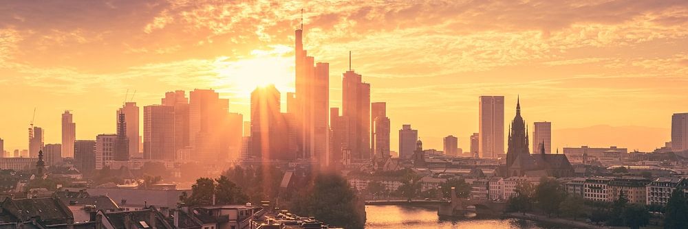Sunset over Frankfurt's Mainhattan, the central business district of Frankfurt am Main in Germany. The word is a portmanteau of Main, the river on which Frankfurt lies, and Manhattan, a reference to the visually impressive high-rises and skyscrapers of the inner city.
