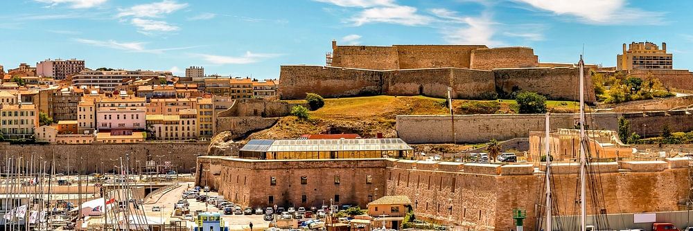 Panorama shot old port in harbour city Marseille France with old town ships and Notre Dame de la Garde
