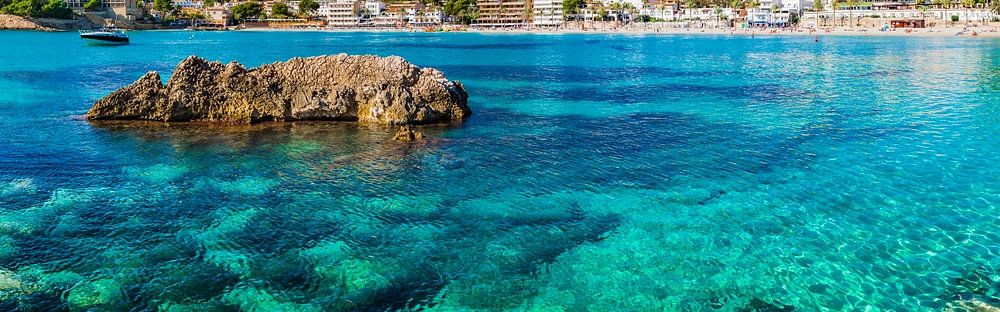 Panorama view of beautiful coastline in Peguera, beach of Platja Palmira, Majorca Spain, Paguera