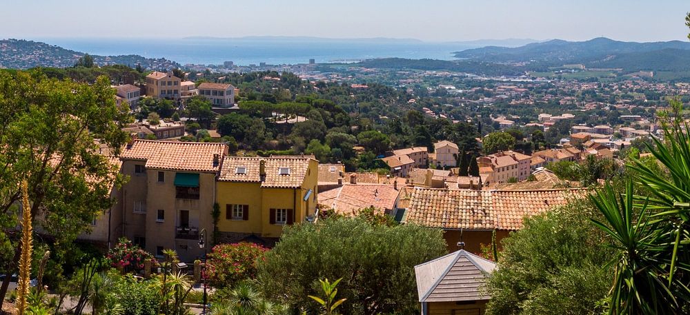 A beautiful panoramic view from Bormes les Mimosas of the Mediterranean sea with a lovely setting of buildings and trees.