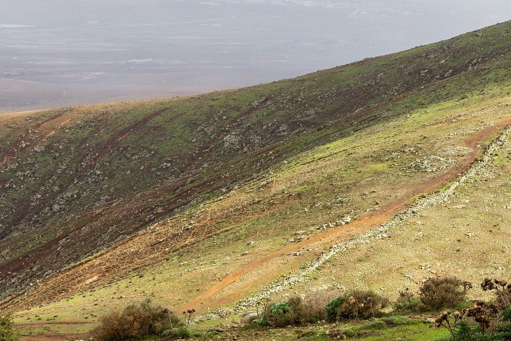 Panoramic view from the viewpoint Mirador Morro Velosa on the volcanic landscape in the interior of the Canary Island Fuerteventura with green vegetation and different coloured mountain formations.