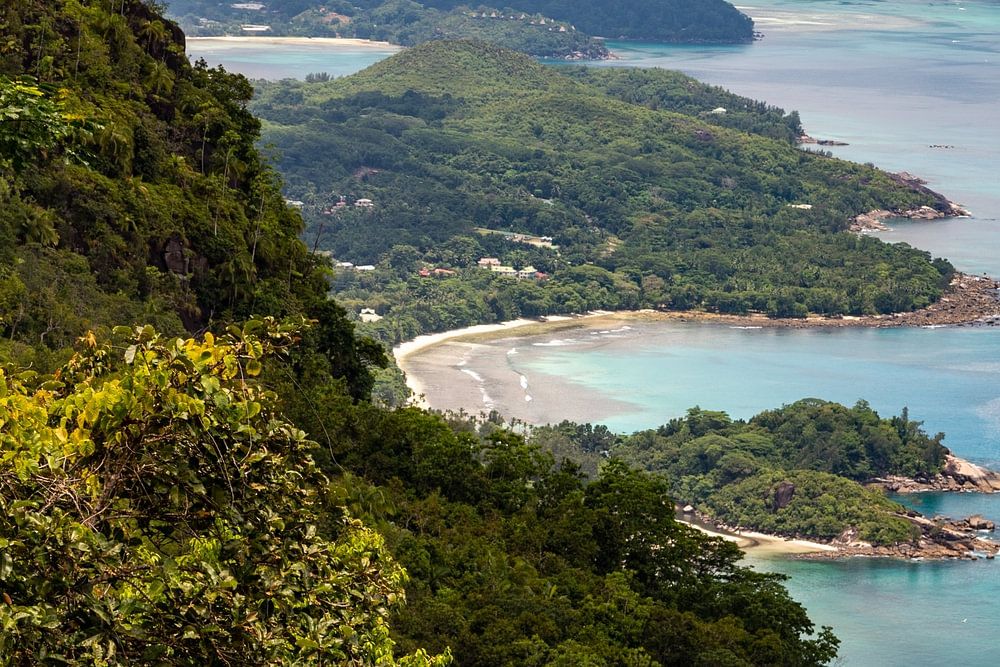 Panoramic view of the coastal landscape on the Seychelles island of Mahé with turquoise water and forested hills