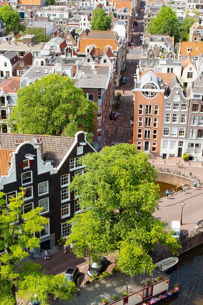 Panoramic view over springtime Amsterdam with the famous canals and typical old merchant's houses. View from the Westerkerk tower (West Church Tower).