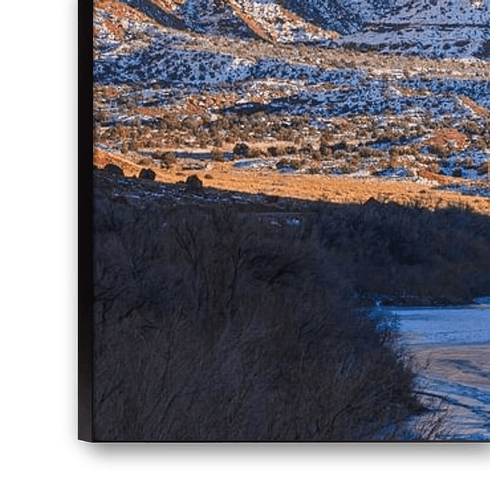 A wide 3:1 panoramic image of a winter sunset at the Fisher Towers along the Colorado River as seen from Highway 128, with the La Sal mountains in the background.