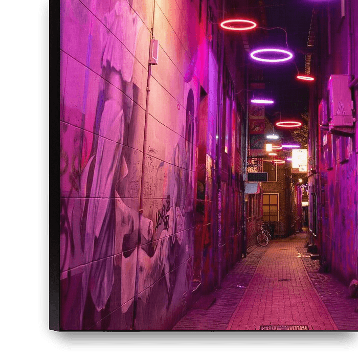 This atmospheric photo shows the Papengang in Groningen - a narrow alley full of colour, light and character. The neon rings in pink and purple illuminate the walls with their vibrant glow, creating an…