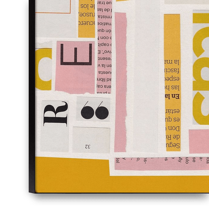 This painting is an abstract paper collage with a dynamic arrangement of text fragments, geometric shapes and blocks of colour. The collage consists of cut-out pieces of paper in a palette of soft pinks, warm yellows, white and occasional black text. The overlapping layers of paper create a sense of depth and texture, while the…