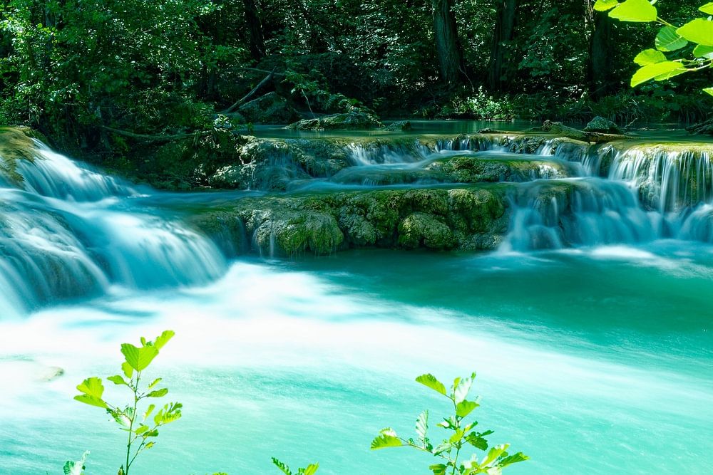 This nature photograph depicts deeply hidden waterfalls in a lush Tuscan jungle, with azure blue water, green vegetation and cascading waterfalls forming a rhythmic, flowing composition. The image exudes a sense of paradisiacal tranquillity and natural harmony, where water, stone and greenery come together to form a magical…