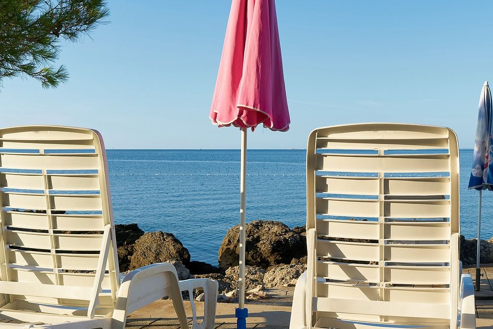 Parasol and sunbeds on the coast of the Adriatic Sea near the town of Krk in Croatia. On the rocky coast of the Adriatic Sea there are few opportunities to go swimming, so in some places the typical concrete bathing places were built