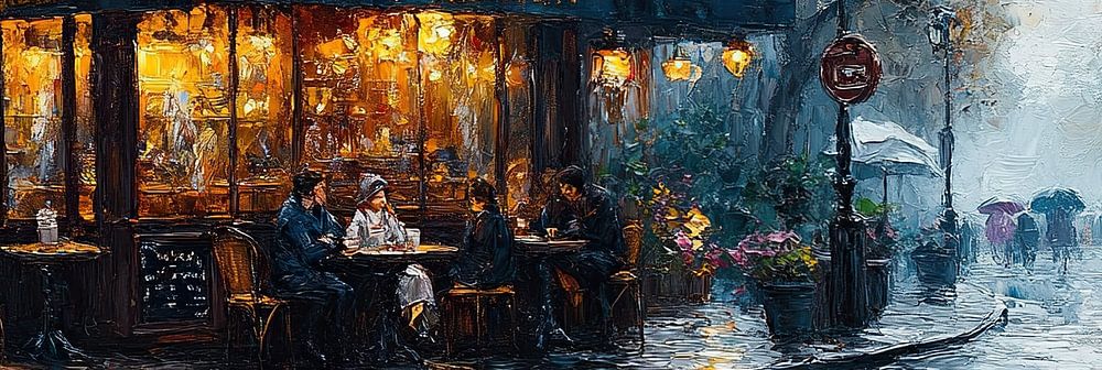 Details: France, Paris, café, rain, evening, city life, art, oil painting, Parisian café, romantic