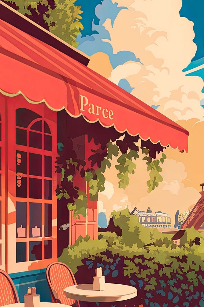 An enchanting café under flowering plants builds a bridge to the sparkling elegance of the city of love. The majestic silhouette of the Eiffel Tower rises in the background, while gentle clouds perfectly round off the heavenly atmosphere. A place where every sip of café brings the soul of Paris a little closer.