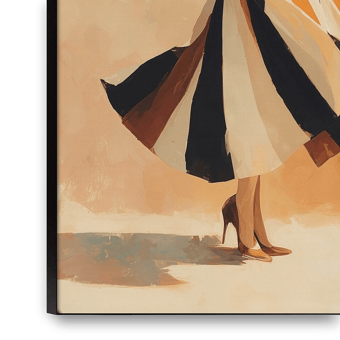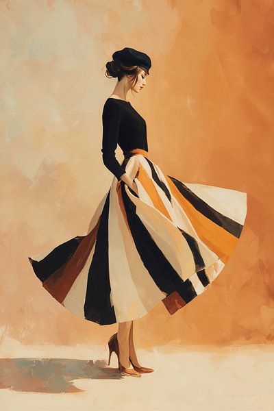 A refined illustration of a woman in a black-and-white ensemble with a spectacular pleated skirt in warm earth tones. The artwork masterfully plays with contrast: the understated top against the striking, dynamically flowing skirt. The neutral background in soft ochre yellow supports the elegant pose and creates an interior that feels…