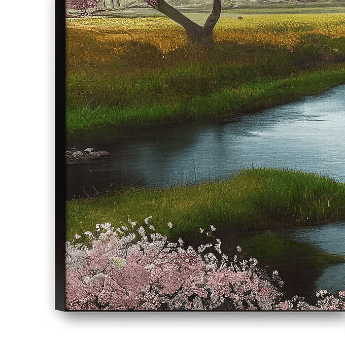 Buy this landscape artwork Park with River and Flowering Trees in Spring Illustration by Christian Keiler on canvas, ArtFrame, poster and wallpaper, printed on demand in high quality.