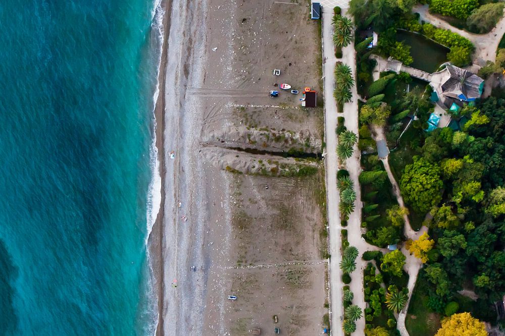 Park with a pond and the road. Hotels among the green park on the seafront with turquoise water and the beach. top down view