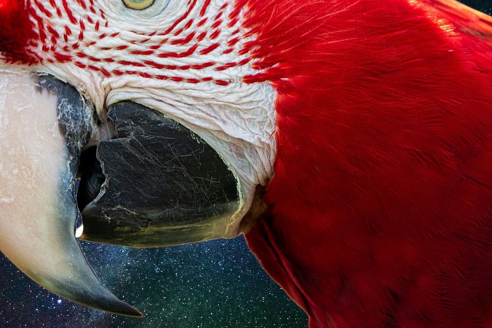 A beautiful scarlet macaw posed in front of my lens. I then placed the parrot in front of a starry sky using software.