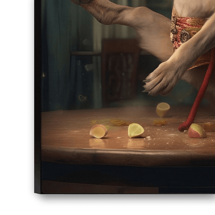 The picture shows an imposing lion dancing on a table. The scenery is quite unusual, because normally one would not find such a king of beasts on a piece of furniture. However, the lion itself is very elegant and seems to enjoy the viewer's attention. Particularly striking is his striking pink mane, which gives him a special charm. In his right paw he holds a cocktail glass and also seems to be enjoying it. Overall, the painting exudes an atmosphere that vacillates between luxury, freedom and fun. It is definitely an interesting work of art that makes you think and smile.