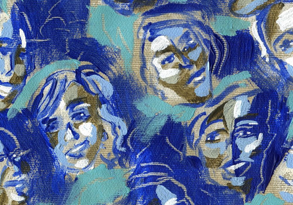 Painting of several faces in various shades of blue, which together form a rhythmic composition. The faces are painted on a pure linen canvas.