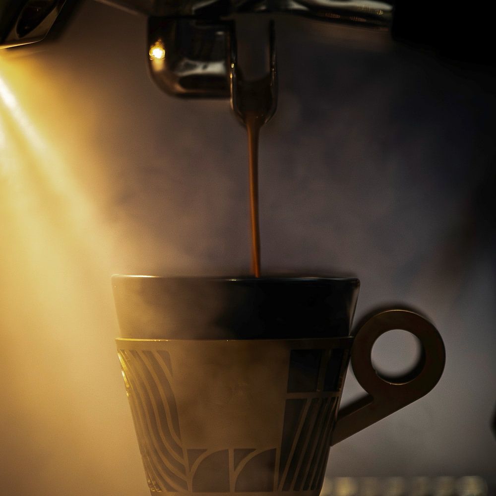 The luxurious ambience is enhanced by the deep tones of the interior and the high-quality materials visible throughout. It is a moment of pure perfection, celebrating the art of coffee making. In this setting, each cup of coffee becomes an experience in itself, a little ritual that symbolises refinement and quality.