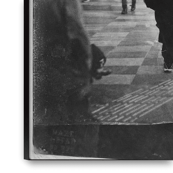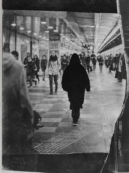 Passing Through depicts the anonymity of modern city life, in which individuals constantly pass one another without really being seen. At the centre of this collage is a dark, almost silhouette-like figure, surrounded by a stream of people, each going their own way. The setting is recognisable as a public space, yet feels simultaneously…