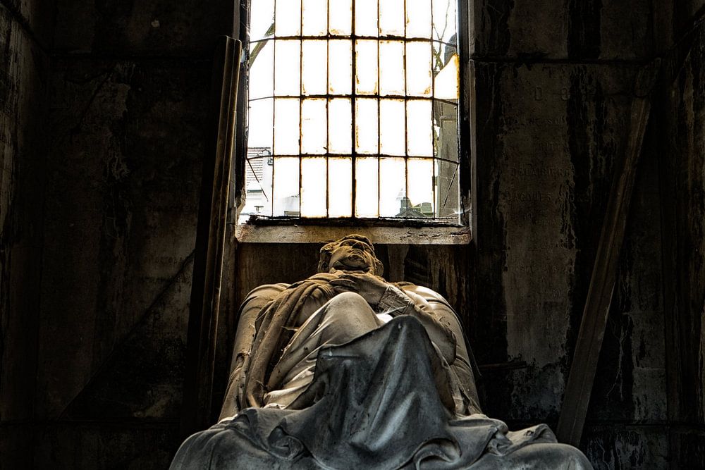 This mausoleum must have looked more glorious in the past but decay has set in or struck. Cemetery of Laeken, Brussels, Belgium.