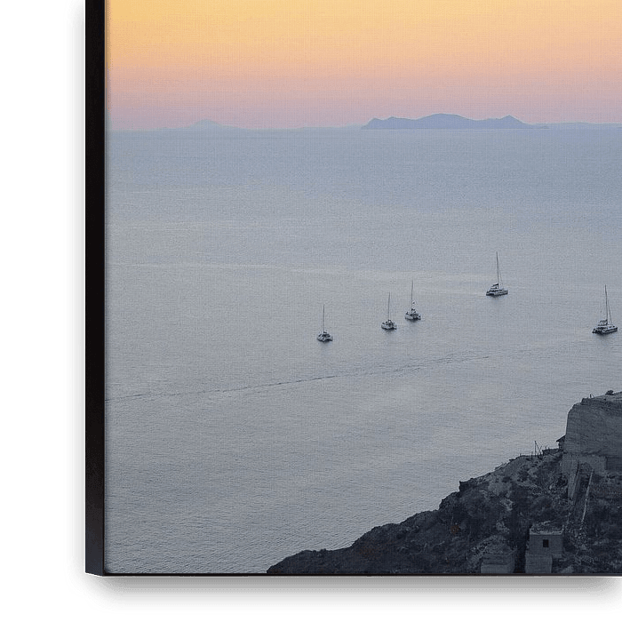 Sailboats floating in the pastel colors of a beautiful sunset on the island of Santorini in Greece. From the vantage point on the castle in the town of Oia, you can see the best sunsets and watch the tour boats leave for the setting sun.