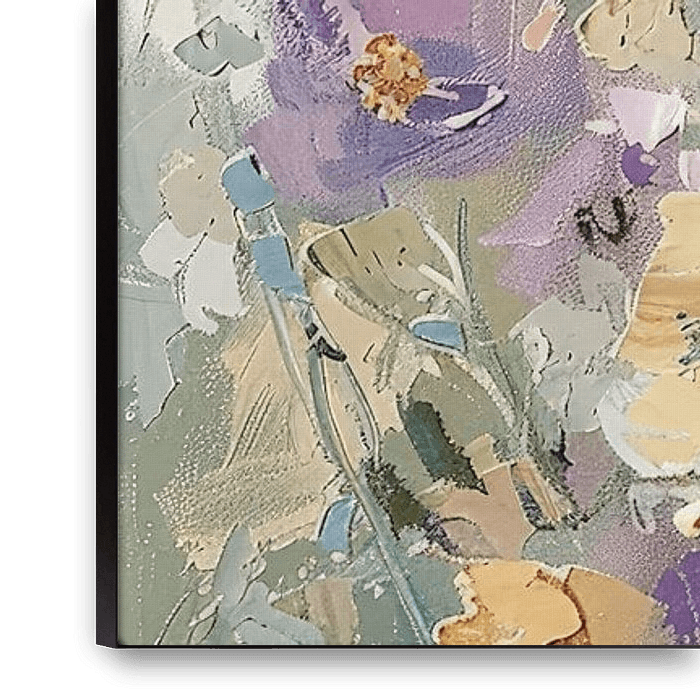 The artist has used a broad palette of soft pastel colours, such as pink, lilac, yellow and orange, combined with deeper accents of purple and blue. The flowers seem randomly scattered, as if growing freely in the wild, but the…