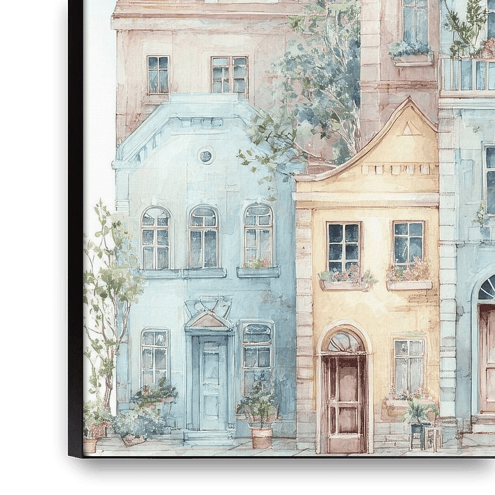 This artwork depicts a row of softly colored houses standing close together, each with its own character and rhythm. Gentle pastel tones of blue, pink, and warm beige blend harmoniously, while small details such as flower boxes beneath the windows, uneven rooftops, and subtle architectural variations give the scene a lived-in, intimate…