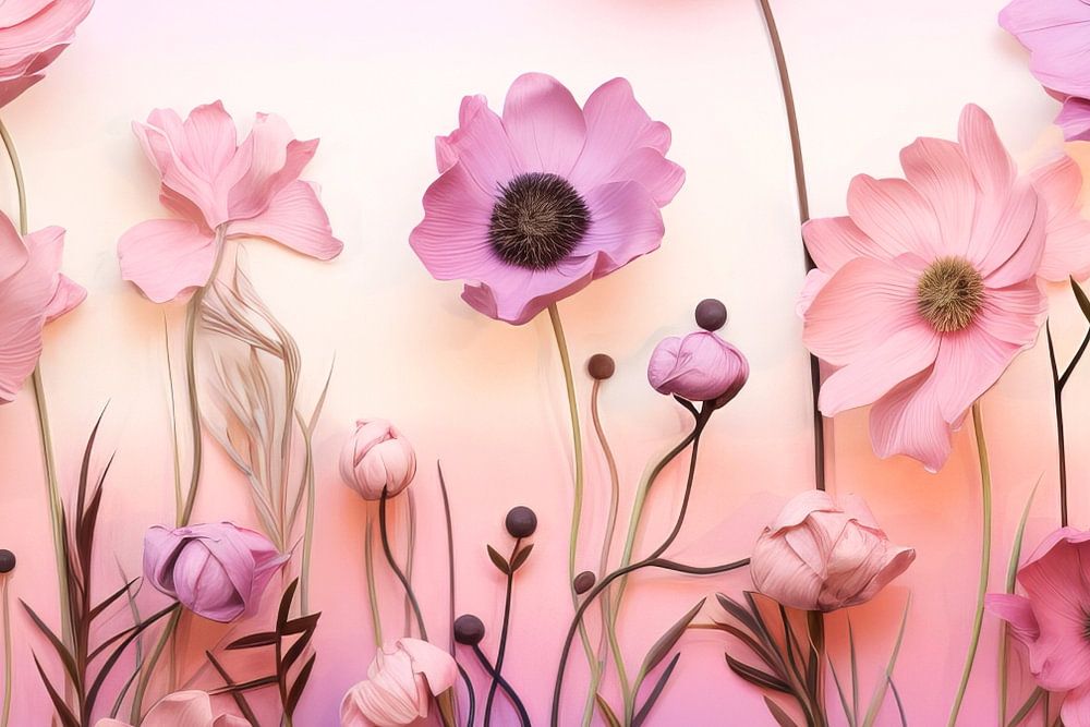 On a pastel pink background, cute pink and purple flowers bloom in full splendour. The delicate blossoms exude a sense of calm and joy as they welcome the viewer like an enchanting scene. The harmony of the pastel shades creates a dreamy ambience and arouses a sense of wonder for the beauty of nature.