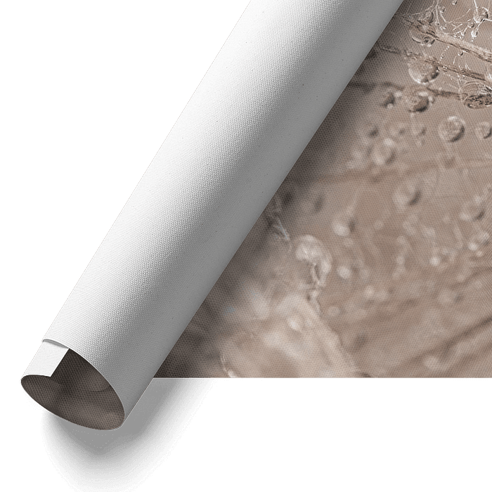 The depth of field is very small, (only a few millimeters of the fluff in the middle and some water droplets) this creates a dreamy atmosphere and also a sense of depth in the work.