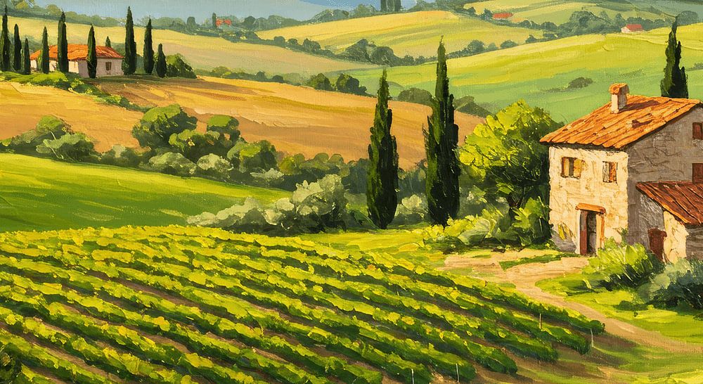 This photo-realistic image captures an exquisite oil painting of a pastoral European countryside, featuring rolling green hills, vineyards, and a charming stone cottage. The photograph beautifully renders the artistic details and inviting warmth of the artwork