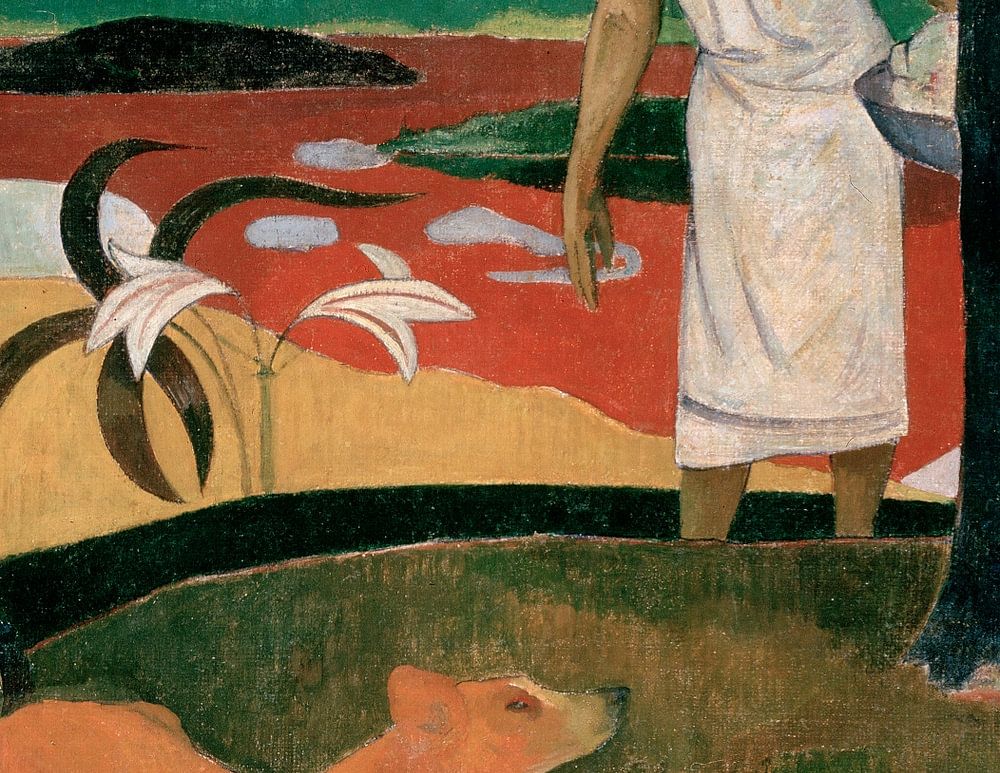 Gauguin intially spent two years in Tahiti (1891-1893), before returning in 1895. This work was painted during that first stay and it captures the idyll of the natural primitive life which Gauguin sought when he set off for Polynesia. He combined this romantic dream with his vivid impressions of the exotic landscape and wildlife, the unusual appearance of the islanders and their natural grace, their mysterious beliefs and rituals. One of the Tahitian girls is playing a flute: the Tahitians devoted flute music to the goddess of the Moon. It is evening, when the sun sets and the times of ritual dances and music in honour of the goddess begin. Beside the dog is what is probably a vessel for sacrifices of small birds and such like, carved out of a pumpkin. The painting is made up of a combination of pure colours, a rhythmic arrangement of lines and broad areas of colour, which is in harmony with the musical theme.