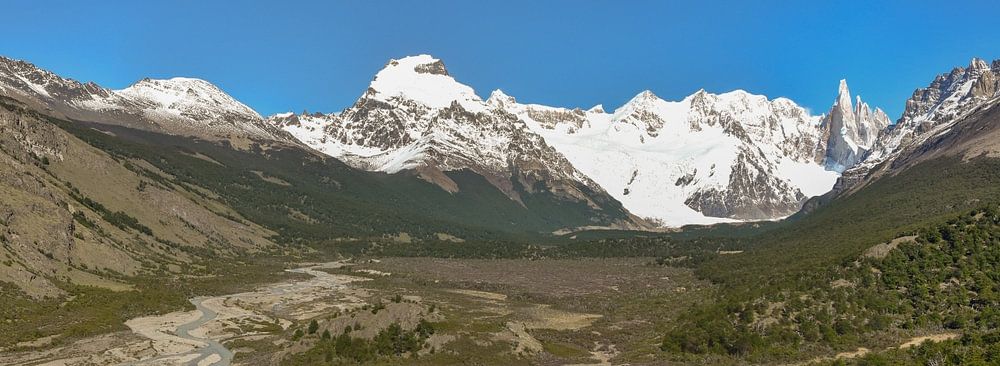 The Rio Fitz Roy river meanders through the valley, in the back mountains Cerro Torre and Fitz Roy with its glaciers and peaks, this is Patagonia's pure nature.