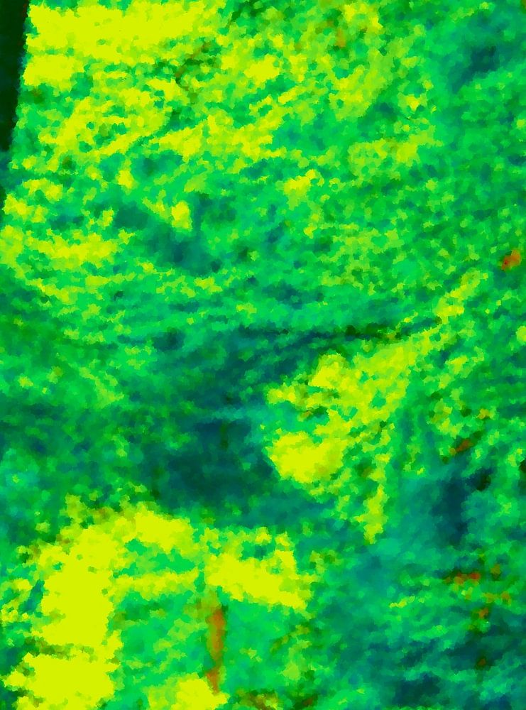 The picture shows a path in the forest in summer sunshine. The colours have changed in an extreme direction.