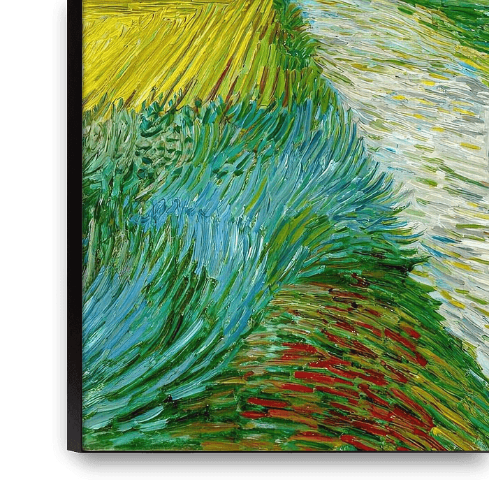 Dieses eindrucksvolle Artwork ist eine Hommage an den unverwechselbaren Stil von Vincent van Gogh und zeigt eine idyllische ländliche Szene mit einem Mann auf einem Fahrrad, der durch eine sonnendurchflutete Landschaft fährt. In der charakteristischen Impasto-Technik des niederländischen Meisters gemalt, zeichnet sich das Werk durch…