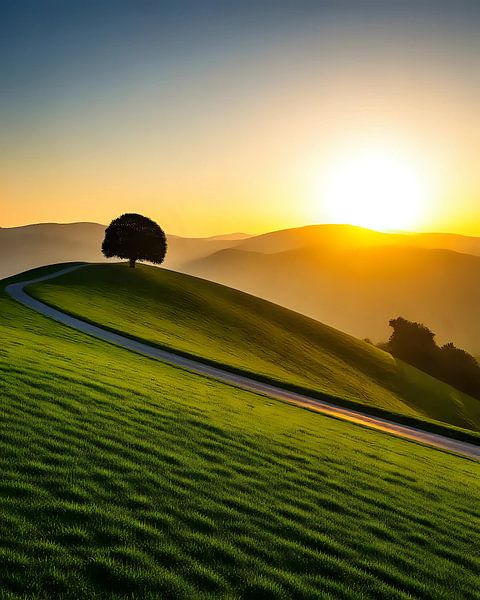 The idyllic rural landscape unfolds on a gently rolling hill, where a single tree stands majestically in the morning sun. The tree, with its expansive crown, is a symbol of tranquillity, its branches swaying gently in the light morning breeze. The meadow, covered with a subtle layer of fresh dew, glistens in the warm golden light that gently streams across the landscape.