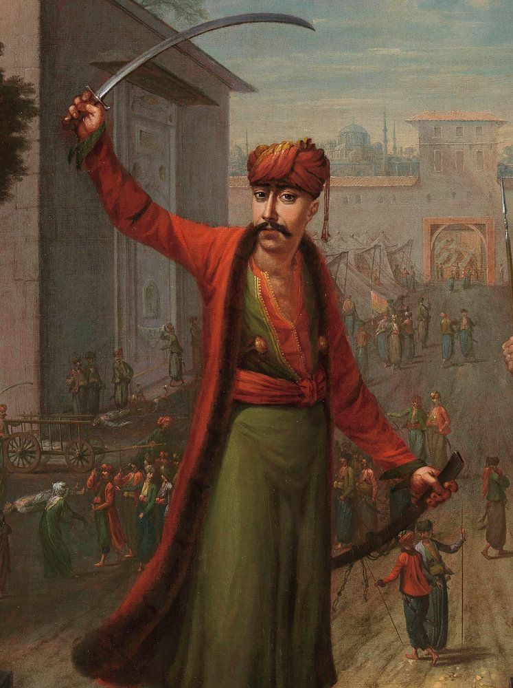 The extravagant feasts of Ahmed III led to riots. On 28 September 1730, an uprising broke out under the leadership of Patrona Halil, an Albanian sailor. The sultan was deposed and his cousin, Mahmud I, installed as his successor. On the left, the corpses of people who died during the uprising are carried away. This is the only painting in the Calkoen collection that Vanmour signed: his name is on the left-hand side of the stone.